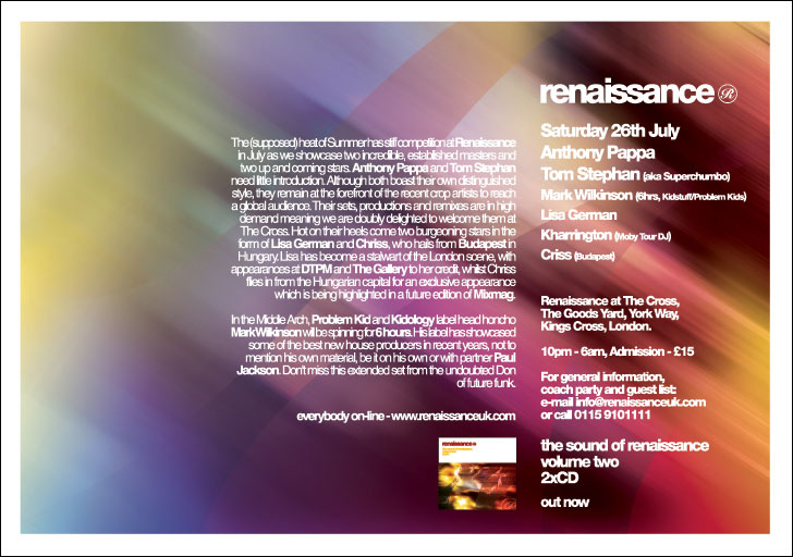 Chriss-t az a megtiszteltetés érte, hogy július 26-án Londonban léphet fel, a legendás hírĹą The Cross-ban. Ezen az éjszakán a Renaissance olyan dj-k mellett ad lehetőséget Krisztiánnak, mint ANTHONY PAPPA, TOM STEPHAN, vagy LISA GERMAN.