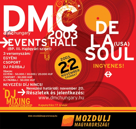 2003. november 22.-én, az Events Hallban kerül megrendezésre hazai DMC Dj bajnokság, ahol a meghívott sztárvendég a De La Soul. A csapatot még azoknak sem kell bemutatni talán, akik nem megrögzött hip-hop rajongók. Ki ne emlékezne a Me, Myself and I címu számra, vagy ihletet kapva a Ring, Ring, Ring hallatán, ki ne próbálta volna legalább egyszer rámondani az üzenetrögzítőjére, hogy Hey, how ya doin'. Ugye, ugye. De La Soul mellett természetesen jelen lesz a hazai élvonal is, akik nemcsak a zsűriben foglalnak majd helyet, hanem bemutatják tudásukat is a nagyközönségnek. Az eseményt az Animal Cannibals vezeti, de a versenyszámok között látható lesz a hazai világbajnok breakcsapat is.