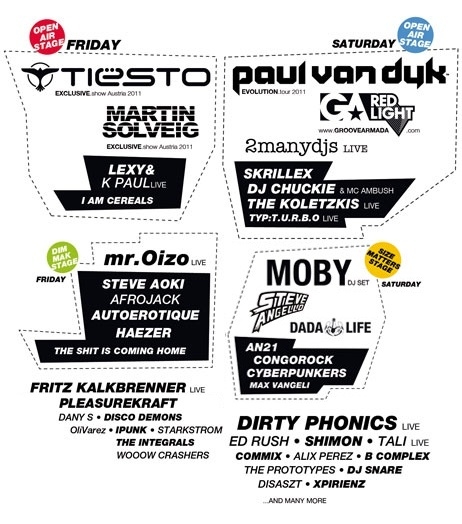 A szervezők büszkén jelentik be, hogy az a fellépő, akit a 2010-es fesztivál felmérésen a legtöbben kértek, belegyezett hogy az idén is csatlakozzon a partyhoz. Tiesto, akit már több alkalommal választottak meg a világ legjobb Dj-jének, a 2010-es briliáns fellépése után újra játszani fog a Beatpatrol fesztiválon. Egy másik visszatérő fellépő Paul van Dyk, aki már bizonyított a 2009-es fesztivál premieren, úgy mint Tiesto Ő is a világ top 10 Dj-je közé tartozik. Szintén újra találkozhattok Steve Aoki-val és csapatával a DIM MAK-kel, akik egy DIM MAK helyszínen fognak játszani. Nem kisebb név mint Groove Armada is ott lesz a fesztiválon, a csapat akiknek a slágere például az "I See You Baby", fellépésükkel pokoli bulit garantálnak a világ minden részén. További hosszú ideje várt fellépő a jelenlegi listavezető Martin Solveig, akinek a st. poelten-i fellépése lez az egyetlen Ausztriában, úgyanúgy mint Tiesto esetében. Nem utolsósorban Moby is ott lesz az idei Beatpatrol fesztiválon, hogy megossza számait veletek. Ezen felül a french electro keresztapa Mr Oizo, is ott lesz úgy mint kimelkedő Lexy & K-Paul Berlinből vagy Haezer Dél-Afrikából és még sokan sokan mások.