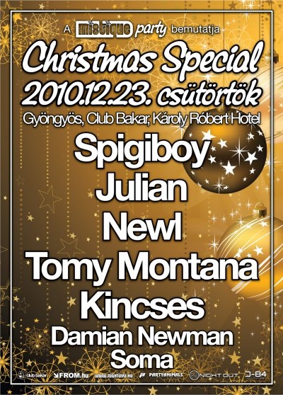Már 3. éve, hogy elkezdtük azt a parti sorozatot megrendezni, amelynek éjszakáján még egyszer összejövünk Szent Este előtt! A barátok, ismerősök, haverok, a MISTIQUE TEAM tagjai, azért, hogy együtt is megünnepeljük a Karácsonyt! Ez idén sem maradhat el! 2010. 12. 23.-án csütörtökön újra Gyöngyösön a Club Bakar ad otthont a CHRISTMAS SPECIAL PARTY-nak! Gyere és ünnepelj velünk.....