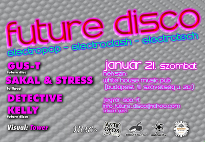 Az év első Future Disco bulija 1 héttel később a meghrdetettnél, tehát 21-én, a White House Music Clubban! Fellépnek: Gus-T (Future Disco), Sakal & Stress (Lollipop), Detective Kelly (Future Disco)