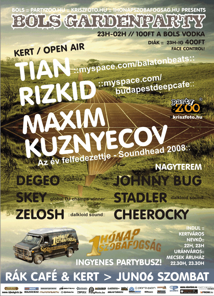 Bols GardenpartyTian, Rizkid, Maxim Kuznyecov a pécsi Rák Café kertjében tartandó house partyn.Rák Café, Pécs,