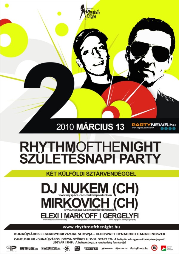 Rhythm of the Night Születésnapi PartyMárcius 13-án a dunaújvárosi Campus Klubban a Rhythm of the Night Bemutatja 2. Születésnapi Partyját két külföldi sztárvendéggel!Campus Klub, Dunaújváros, Dózsa György u. 35-37.
