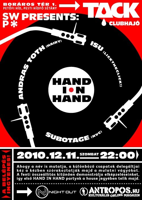 Hand In HandAhogy a név is mutatja, a különböző csapatok delegáltjai kéz a kézben szórakoztatják majd a mulatni vágyókat.Tack Clubhajó, Budapest, Boráros tér 1. (Petőfi híd pesti hídfő sétány)