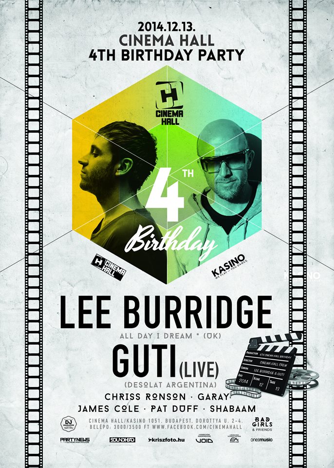 Cinema Hall BirthdayKedvenc mozink negyedik születésnapja alkalmából próbáltunk illusztris társaságot összeverbuválni. Ezúttal azonban nem a lemezlovasokra, hanem Rátok, az igazi kedvenceinkre, a közönségre gondolunk. Mi pedig csak remélhetjük, hogy megtiszteltek minket bizalmatokkal.Cinema Hall